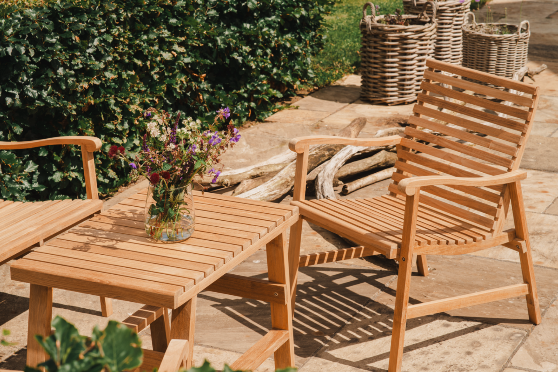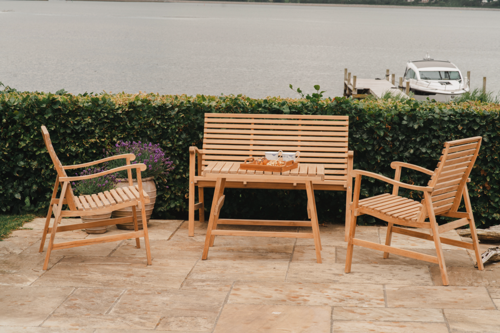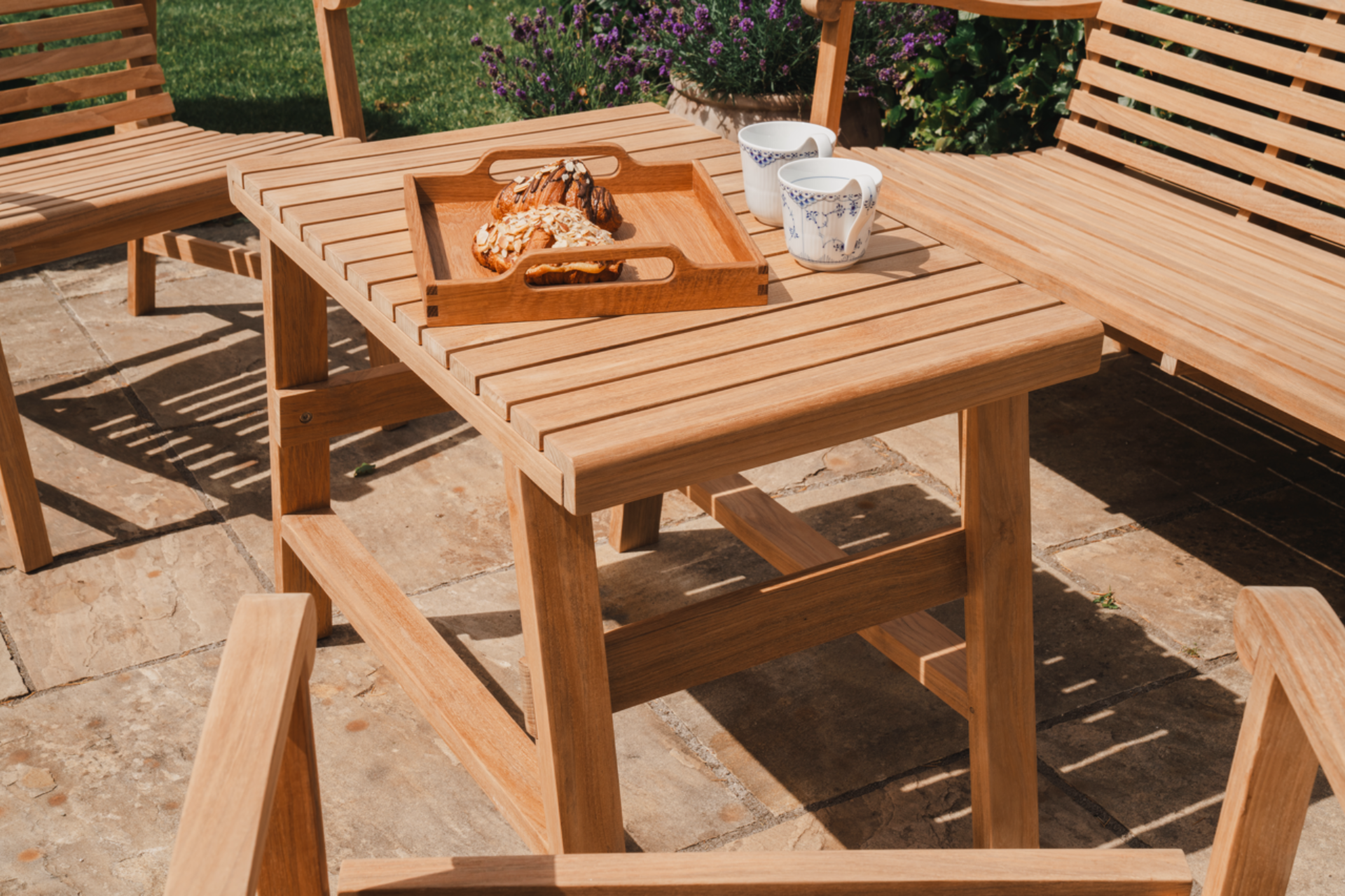 Havesættet er fremstillet i tynde dimensioner af teaktræ, hvilket overraskende giver en utrolig stærk konstruktion uden at gå på kompromis med æstetikken. Denne designbeslutning sikrer ikke blot holdbarhed, men også en fantastisk siddekomfort, der inviterer til lange, afslappende stunder.