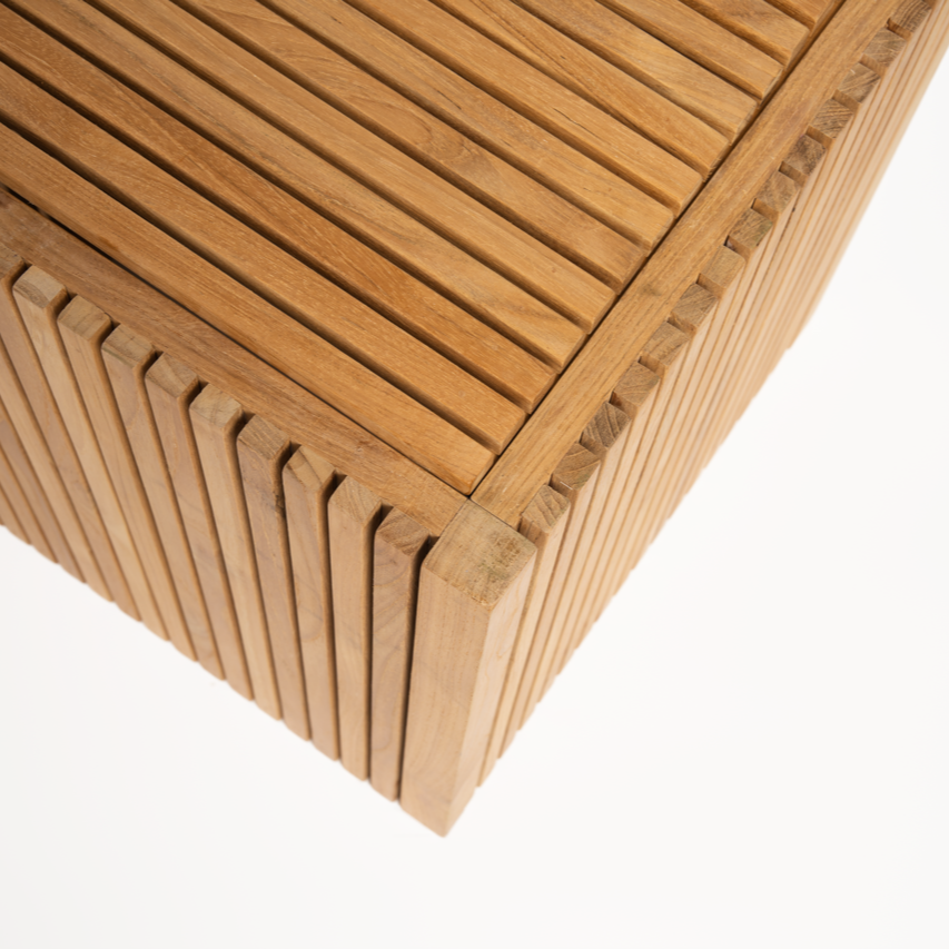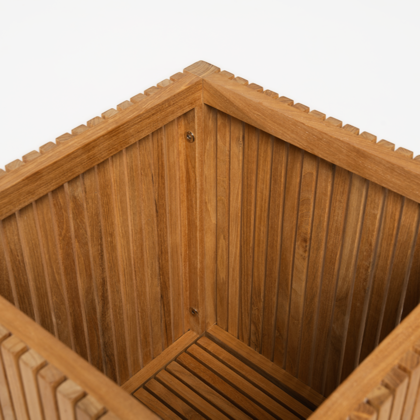 Planteskjuler i klassisk dansk design leveres usamlet og er fremstillet af lange, smalle lameller i teaktræ.