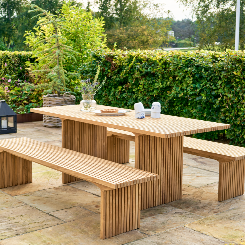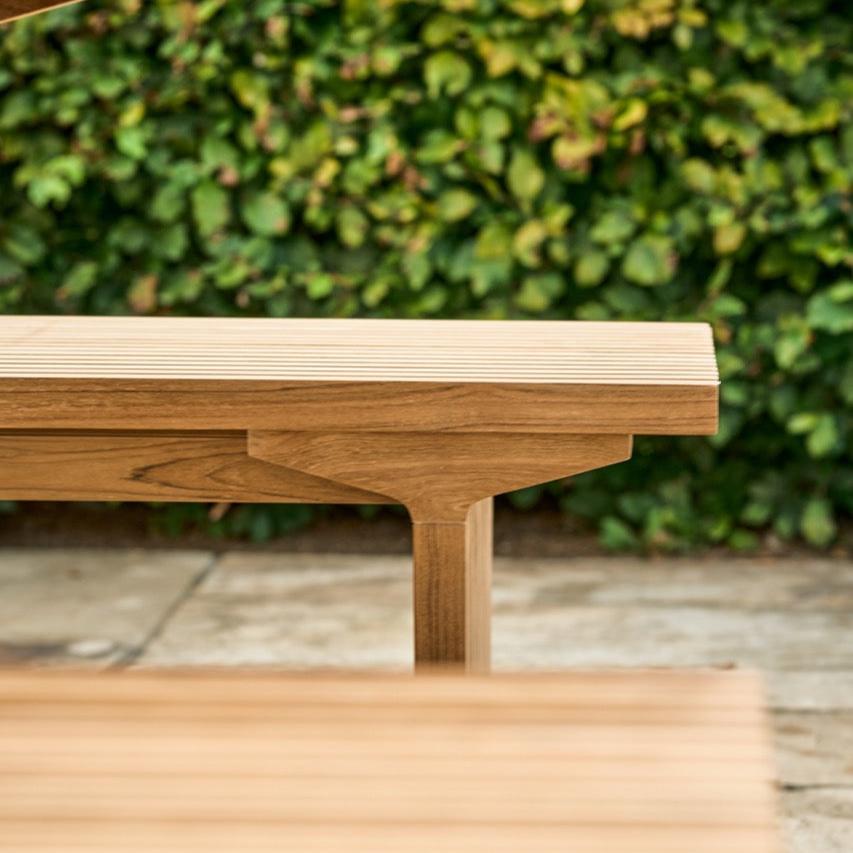 Parallel er en skulpturel serie af havemøbler lavet af tynde lameller af massivt teaktræ. Serien består af et bord og to bænke