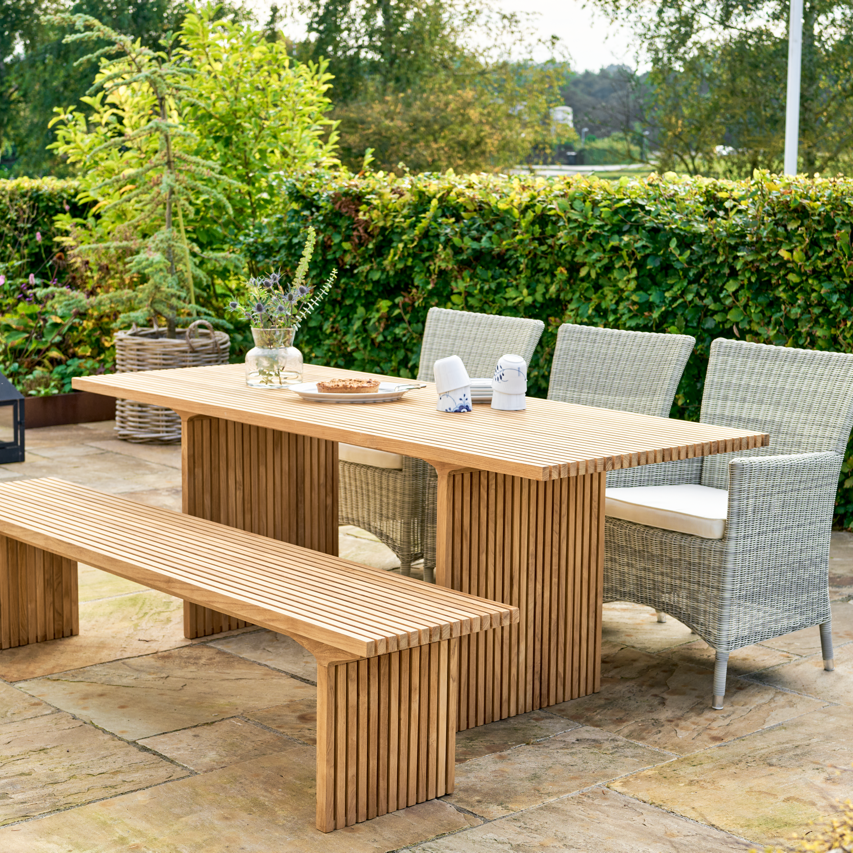 Parallel er en skulpturel serie af havemøbler lavet af tynde lameller af massivt teaktræ. Serien består af et bord og to bænke