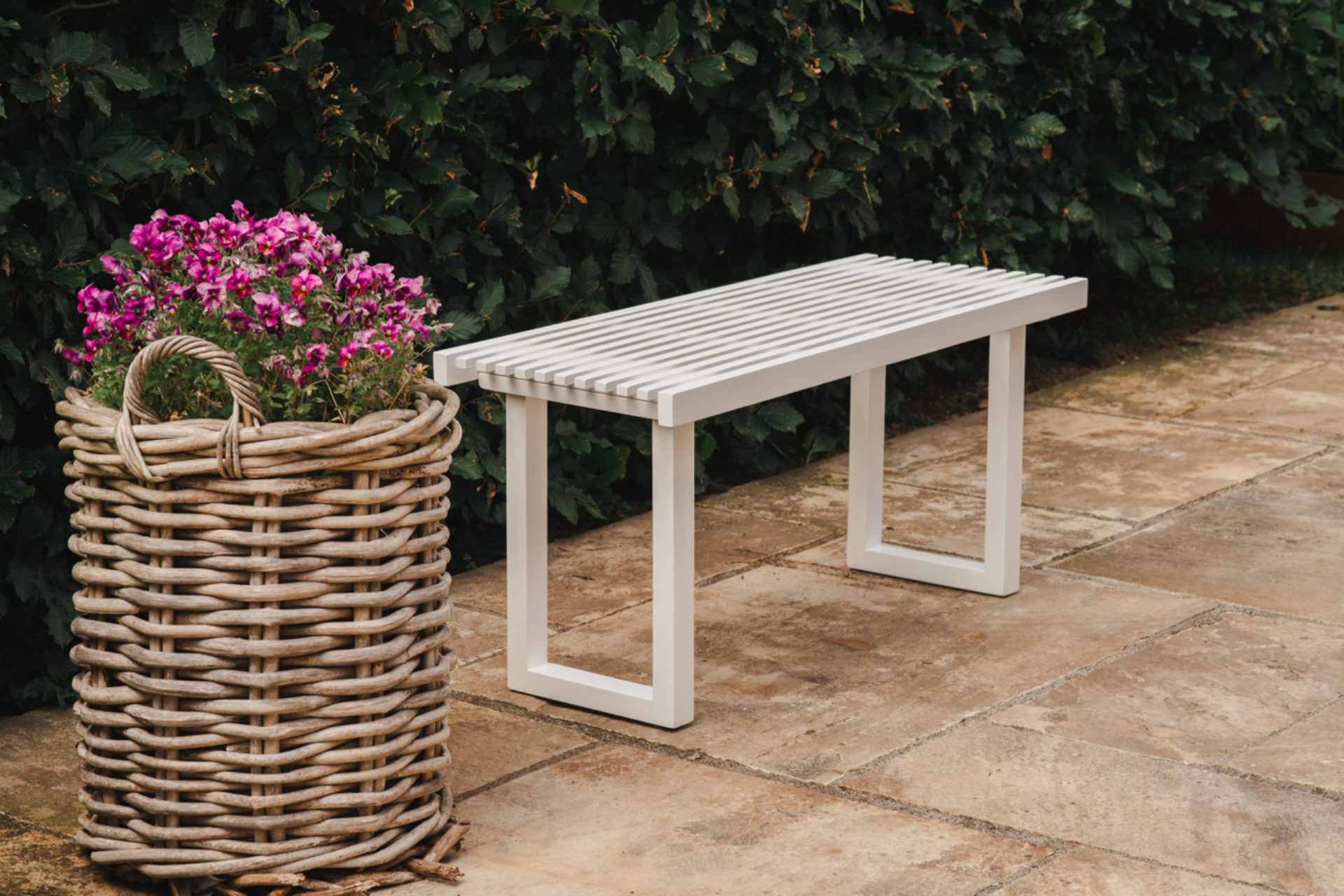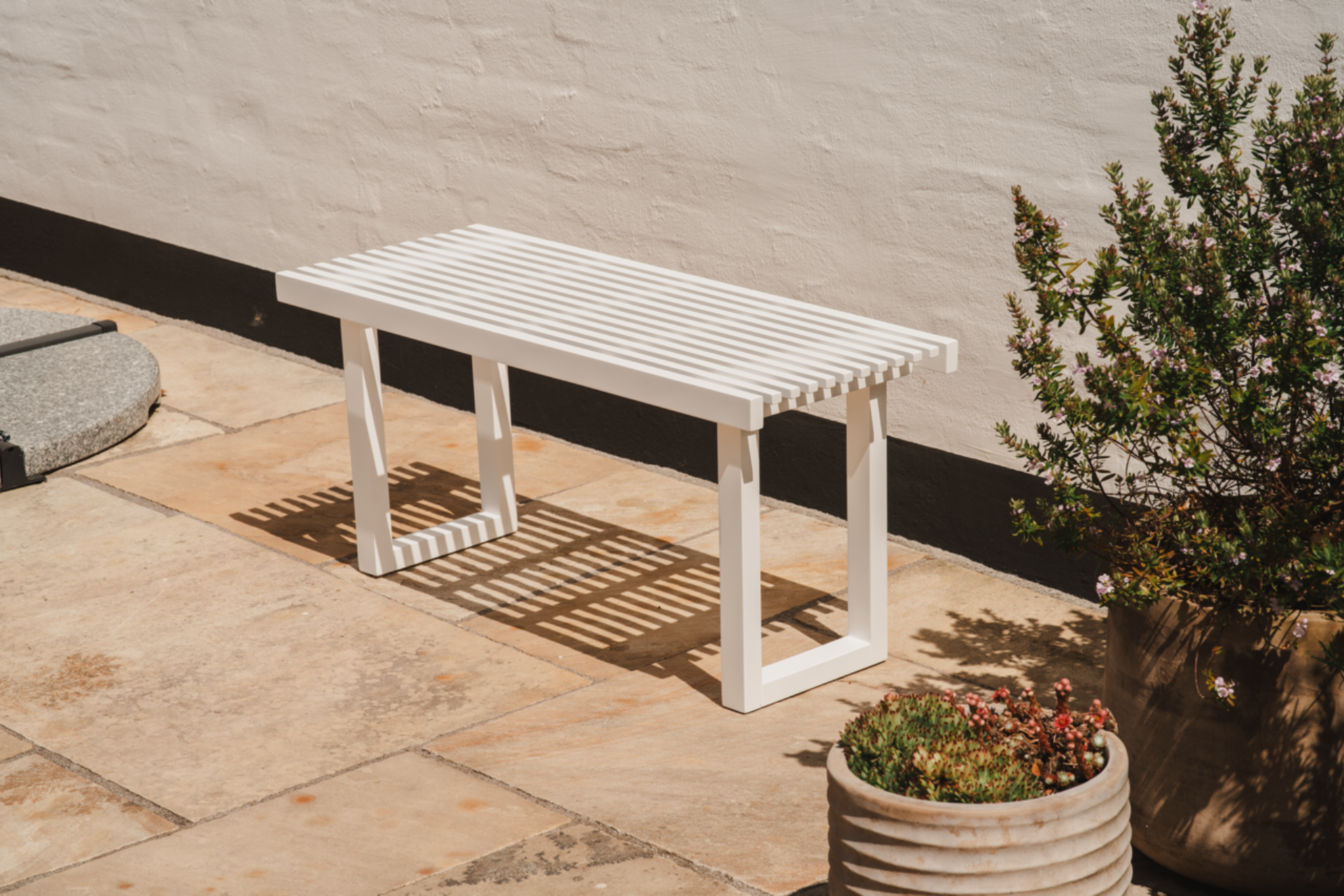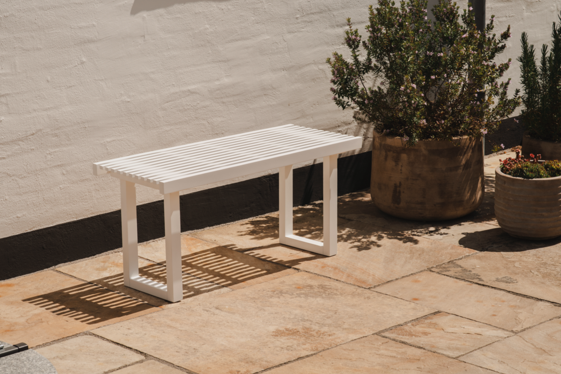 Bænken i mat hvid, kræver ingen vedligeholdelse, kun aftørring med en fugtigt klud.