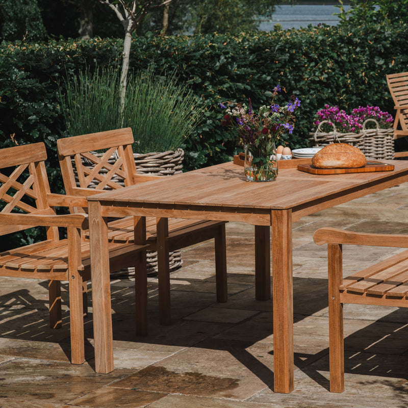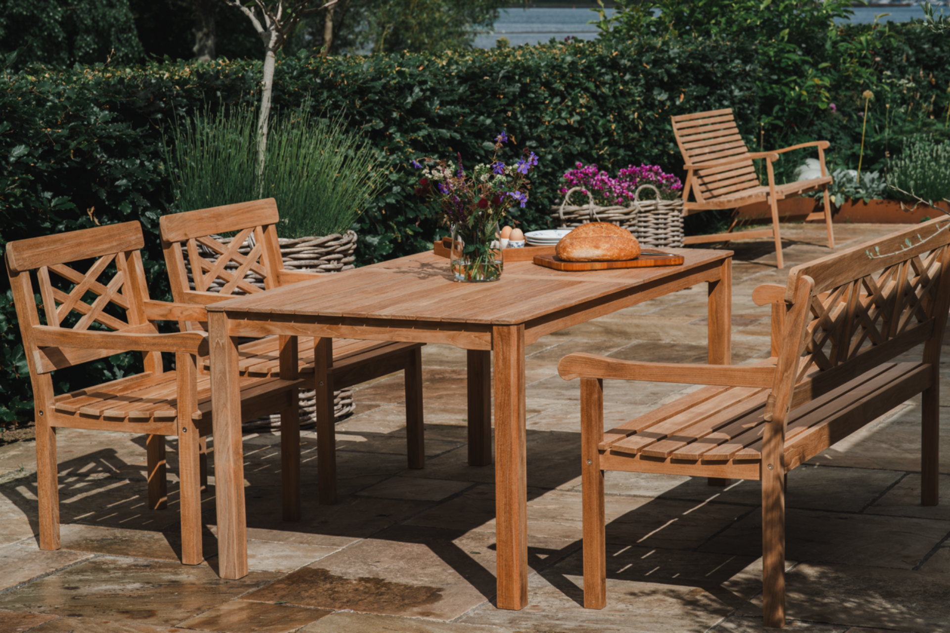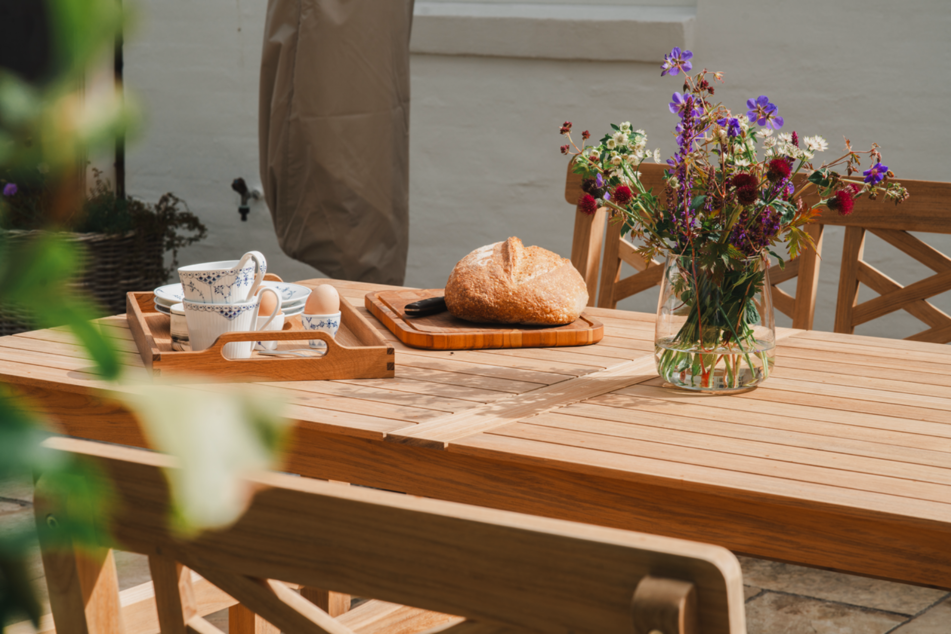 Teaktræ er værdsat for sit høje olieindhold, som gør det modstandsdygtigt over for vejr, fugt, råd og insekter. Dette gør teak ideelt til havemøbler, der skal modstå skiftende vejrforhold. Havesættet er konstrueret til udendørs brug med designløsninger, der minimerer risikoen for, at træet giver sig eller deformeres over tid på grund af vind og vejr.